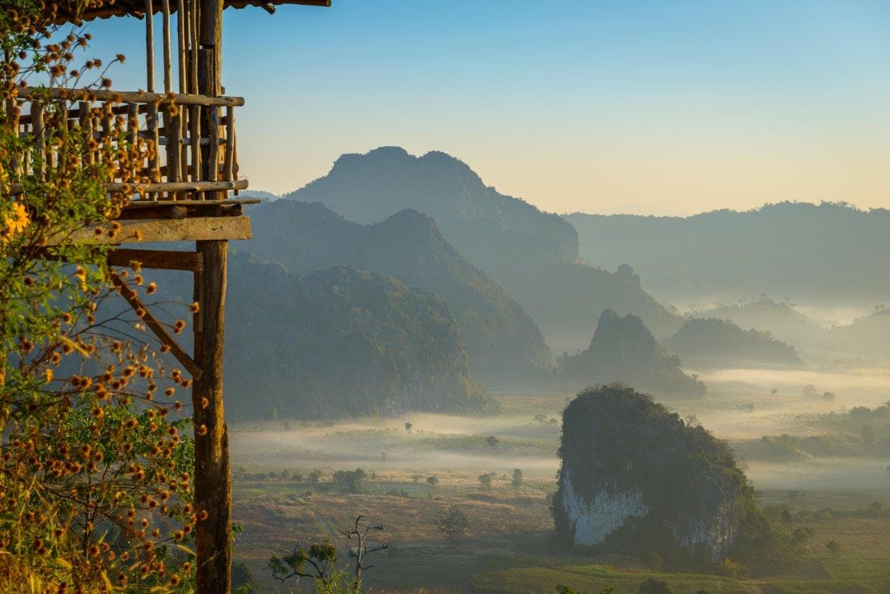 Después del desayuno, explora el maravilloso Wat Phra That Lampang Luang, cerca de Lampang, y maravíllate con las elaboradas decoraciones y hermosas estatuas de Buda. Continúa hacia el norte, haciendo una breve parada en el lago Phayao para tomar un café. En las afueras al sur de Chiang Rai harás una parada en el magnífico Wat Rong Khun, un deslumbrante templo construido en la década de 1990. Su exterior ornamentado totalmente blanco con espejos incrustados le da un aspecto resplandeciente, lo que lo convierte en uno de los templos más bellos de Tailandia. Continuaremos hacia Chiang Rai para almorzar. Después, dirígete al Triángulo Dorado, donde convergen Tailandia, Laos y Myanmar. Este silvestre paraje natural adquirió una fama indeseada durante la década de los sesenta debido al abundante cultivo de opio en la zona. A continuación, disfruta de un paseo en barco por el Triángulo de Oro con parada en la isla de Don Sao, que forma parte de Laos (el viaje en barco dura aproximadamente 45 minutos). Más tarde, visita la 212 House of Opium y contempla su curiosa colección de parafernalia relacionada con el opio, que incluye pesas, balanzas y pipas. Conoce la historia de esta droga y el efecto devastador de su comercio sobre las comunidades locales.
